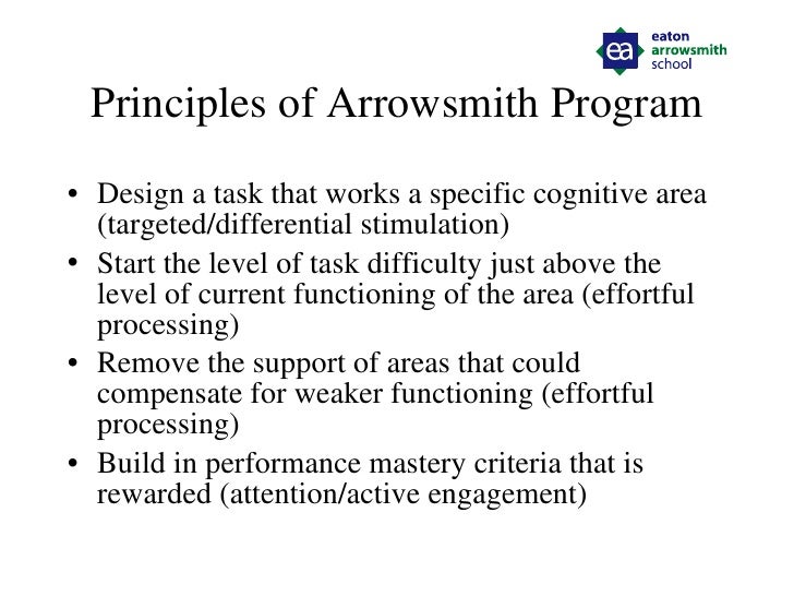 Report on Academic Skills & Learning Outcomes This report summarizes how the Arrowsmith Program cognitive exercises are directly and very specifically related to a wide range of learning difficulties. The report describes the relationship between the function of the cognitive areas for which the Arrowsmith Program has developed specific, targeted exercises, the learning difficulties if a student has a deficit in the cognitive area, and the learning outcomes achieved upon completion of the Arrowsmith Program exercises.