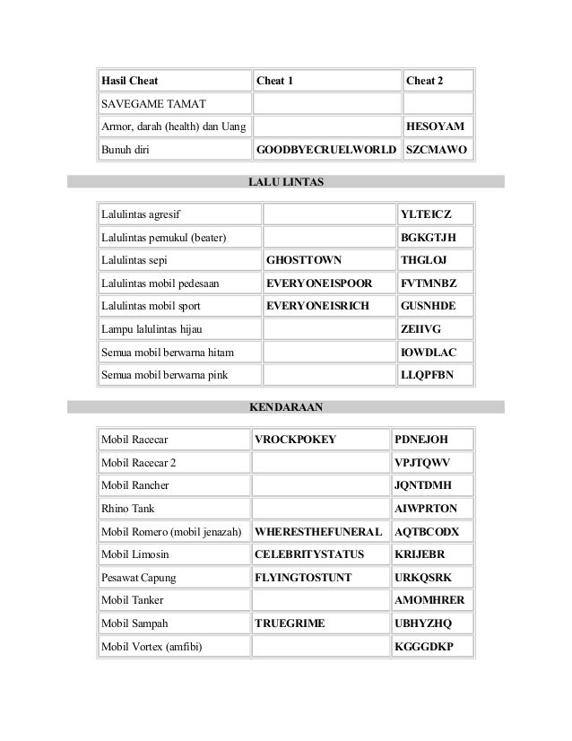 Disini saya akan memberikan Cheat, Password, Kode GTA San Andreas PS2 yang paling lengkap yang saya dapat dari berbagai sumber di Internet. Cheat ini menurut saya akan lebih menyenangkan digunakan di game seperti ini, membuat gamers tidak bosan. Cheat GTA PS2 Langsung Tamat, mobil kebal, kiamat, setengah dewa, nyawa darah panjang, mobil mewah semua misi selesai, mendapatkan senjata mesin, darah ga habis-habis, memanjangkan darah, lari cepat, bintang 6, polisi hilang,mobil balap. Oke tanpa panjang lebar, dibawah ini saya tulis Cheat Gta Indonesia Darah Kebal di Laptop dan Komputer. Pertama siapkan parasut, 1 mobil dan 1 motor. Kemudian aktifkan cheat 'Mobil Melambung'(kotak, R2, bawah, bawah, kiri, bawah, kiri, kiri, L2, X). Naikilah motor dan tabraklah bagian belakang mobil yang sudah kamu siapkan tadi dengan sangat pelan-pelan.